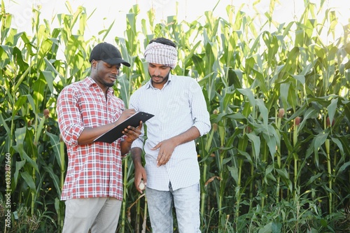 Two African and Indian farmers check the harvest in a corn field.