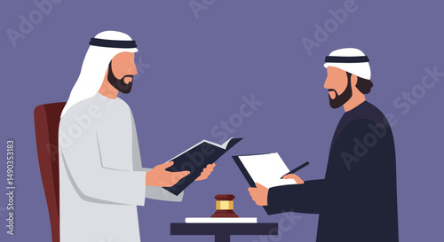 agreements, business, law, contract, meeting, people, man, document, signing, discussing, deal, corporate, office, paper, lawyer, client, lawyer, formal, arab, middle eastern, islamic, culture, traditional, dress, white, black, clothing, beard, sitting, gesticulate, conversation, court, justice, gavel, hammer, wooden, table, interior, flat, illustration, vector, graphic, design, purple, background, half face, two people, adult