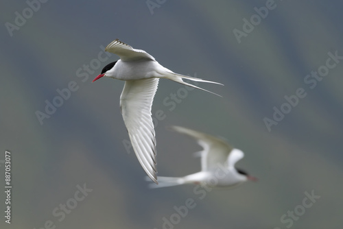 Two Arctic terns - Sterna paradisaea - with spread wings in flight at blue background. Photo from Snaefellsnes Penisula in Iceland. The Arctic tern is famous for its migration.