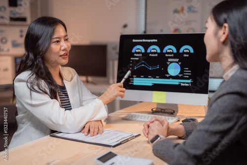 business, marketing, strategy, infographic, computer, screen, office, work, working, night, businesswoman, woman, asian, discussion, analysing, datum, analysis, chart, graph, presentation, planning, project, teamwork, collaboration, meeting, finance, sale, growth, investment, report, information, technology, digital, online, businesswoman, corporate, executive, professional, company, startup, desktop, keyboard, mouse, document, desk, indoor