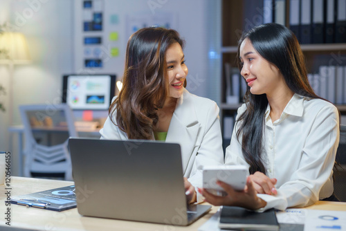 business, office, work, woman, businesswoman, laptop, computer, calculating machine, discussing, working, night, teamwork, collaboration, technology, finance, accounting, analysis, strategy, planning, marketing, sale, project, management, deadline, career, professional, job, corporate, company, startup, entrepreneur, success, achievement, growth, development, meeting, communication, partnership, support, motivation, inspiration, leadership, desk, document, chart, graph, evening, light, asian