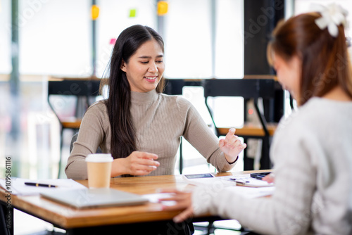 Two asian confident business people point to graphs and charts to analyze market data, balance sheet, account, net profit to plan new sales strategies to increase production capacity.