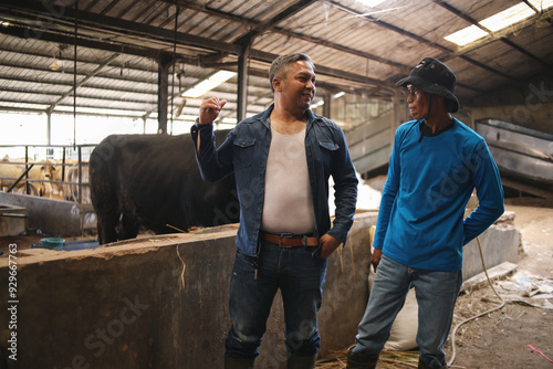 business, farmer, cow, people, man, animal, happy, team, agriculture, asian, owner, industry, men at work, beef, farm animal, manager, cattle, stock, bull, tradition, husbandry, production, byre, byre, good, guy, male, standing, successful, 2, farm, walking, working, hat, barn, conversation, negotiate, adult, ox, inspecting, monitoring, inside, shed, work, job, routine, herd, breeding