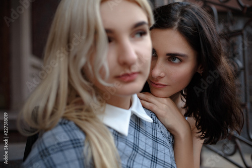 Two attractive young lesbians. Looking somewhere aside. Samesex love concept.