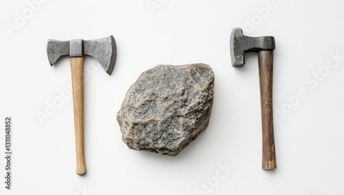 Two Axes and a Rock on White