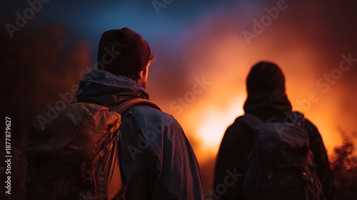 Two backpackers observe a dramatic fiery glow in the wilderness at dusk