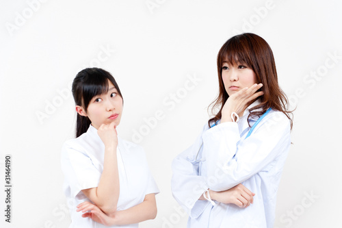 woman, two people, plural, labcoat, nurse, nurse, nurse, doctor, doctor, doctor, uniform, costume, white, contemplate, deliberation, recollect, thinking, trouble, hospital, medical care, angel, emergency, exam, refreshing, clean, uniform, work, business, sweet, beauty, clean, elegant, young, advertisement, copy space, white background, portrait, nature, japanese, chinese, asian