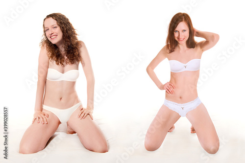 Two beautiful laughing women wearing white underwear in front of bright studio background