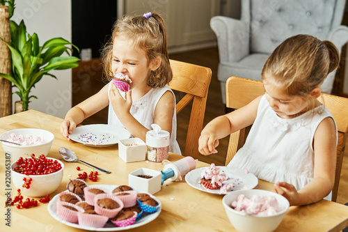 two beautiful sisters in white dresses decorate and eat delicious cupcakes at a wooden table