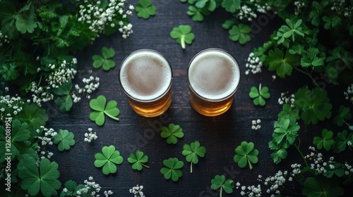 Two beers on a table, surrounded by Irish Clovers and sprigs.