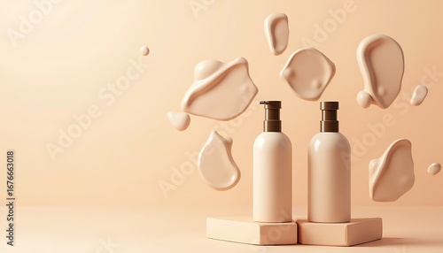 Two Beige Bottles with Pump Tops on Beige Stands with Beige Splatters