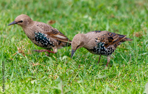 Two birds are standing in a grassy field