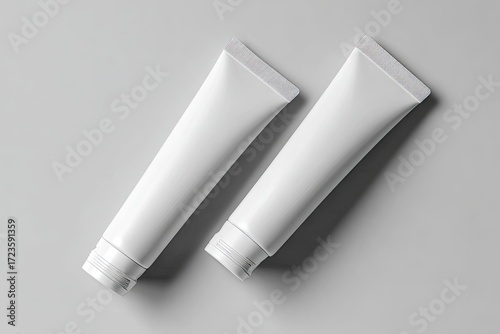 tube, cosmetic, product, cardboard box, blank, white, empty, plastic, cream, face, body, lotion, gel, bottle, container, design, illustration, three-dimensional, rendering, minimalist, modern, clean, simple, light, grey, background, top, view, flat, studio, advertising, branding, promotional, high-quality, realistic