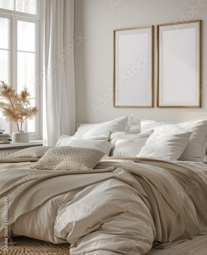 two blank wooden frames on the wall above the bed, cozy bedroom with white walls, beige and light grey interior decor, window in the background
