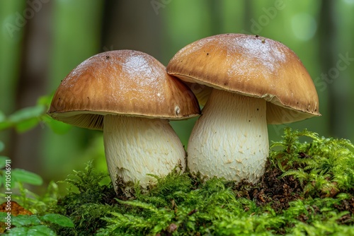 Two brown and white mushrooms sprout from the forest floor, surrounded by vibrant green moss. The bright, natural lighting makes this an ideal stock image.