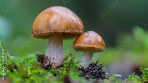 mushroom, mushroom, fungal, fungal, nature, forest, timberland, green, moss, brown, white, cap, stem, growth, life, macro, closeup, detail, texture, organic, natural, wild, outdoors, environment, botany, mycology, biology, science, plant, flora, earth, dirtied, ground, ecology, biodiversity, autumn, fall, season, wet, damp, dew, fresh, delicate, fragile, small, large, pair, duet