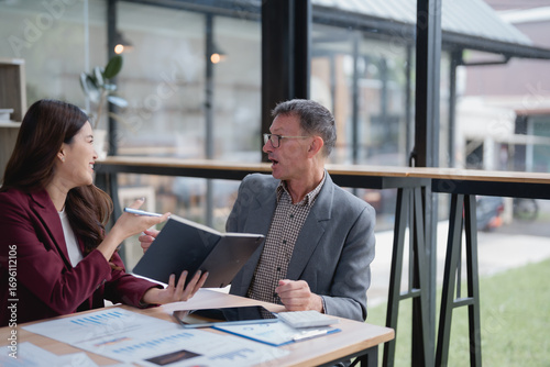 Two business people are discussing during a meeting, analyzing financial charts and data to improve their business strategy in a modern office