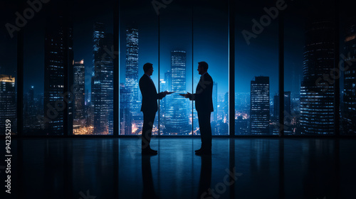 Two business professionals are silhouetted against city skyline at night, exchanging documents with backdrop of illuminated skyscrapers.