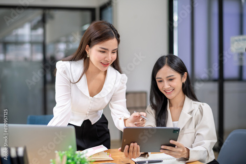 Two business worker consult and plan together. Brainstorm, share, and discuss business project ideas.