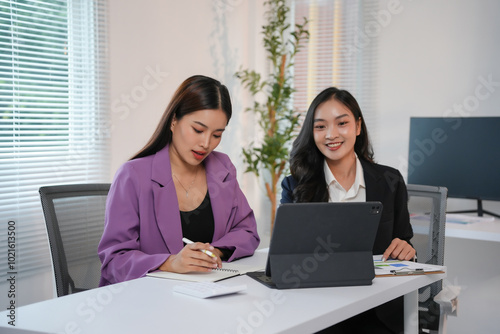 business, businesswoman, woman, office, meeting, planning, project, digital, tablet, laptop, computer, technology, communication, collaboration, teamwork, strategy, marketing, finance, investment, sale, growth, success, professional, corporate, executive, entrepreneur, startup, small, desk, chair, window, indoor, smiling, happy, confident, 2, people, paperwork, analysing, document, datum, graph, chart, brainstorming, creative, innovation, modern, diverse, asian