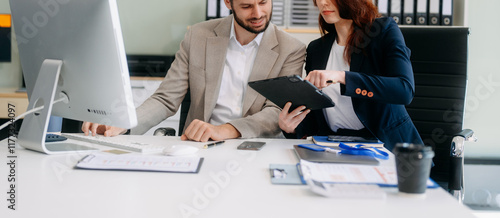 Two busy happy professional business man and woman executive leaders team using laptop working
