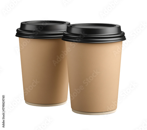 Two Cardboard Coffee Cups with Black Lids isolated on a transparent background
