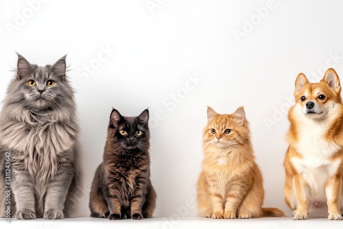 cat, dog, studio, posing, fluffy, fur, soft, love, light, elegance, pet, elegant, companionship, togetherness, calmness, warmth, photo, serene, modern, maine coon, tabby, tail, whisker, nose, ear, paw, portrait, indoor, domestic, peaceful, harmonious, oneness, affection, joy, bond, charme, contemporary, atmosphere, innocence, family