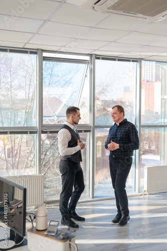 2, caucasian, man, work, office, talking, male, discussion, conversation, meeting, communication, consult, cooperation, collaboration, teamwork, organisation, team, professional, diverse, employee, colleague, co-worker, businessman, two people, indoor, entrepreneur, business, walking, togetherness, partner, suit, corporate, relaxation, leadership, enjoyment, adult, leader, success, project, manager, informal, modern, finance, businessperson, guy, man, executive, company, career, partnership