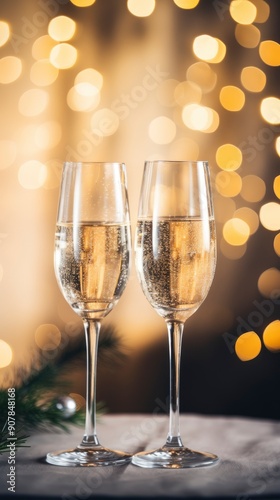 Two champagne glasses filled with sparkling wine, placed on a table with a festive bokeh background.