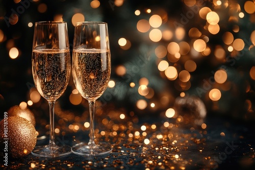 Two champagne glasses sparkling on a festive background for new year's eve