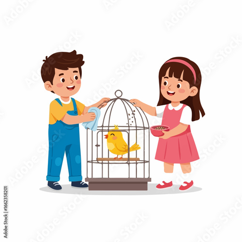 children, boy, girl, canary, bird, cage, cleaning, feeding, food, happy, cheerful, joyful, heartwarming, care, responsibility, pet, friendship, sibling, teamwork, illustration, cartoon, vector, graphic, bright, colourful, playful, cute, adorable, innocent, childhood, nature, animal, domestic, home, family, love, affection, tenderness, pastel, vibrant, whimsical, simple, clean, white background, childlike, carefree