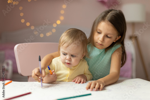 two children draws at the table in the room,
