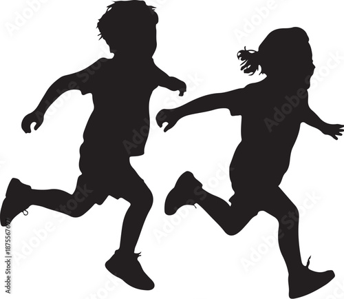 Two children running silhouette black white
