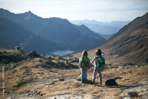 Two children with backpacks in high mountains holding hands looking into the distance