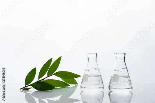 leaves, biotechnology, green, science, flask, chemical, development, cosmetic, beauty, health, test, chemistry, ecology, genetic, agriculture, scientific, laboratory, experiment, biology, nature, water, environment, plant, bottle, medicals, research, white, organic, glasses, natural, medicine, leaf, laboratory, background