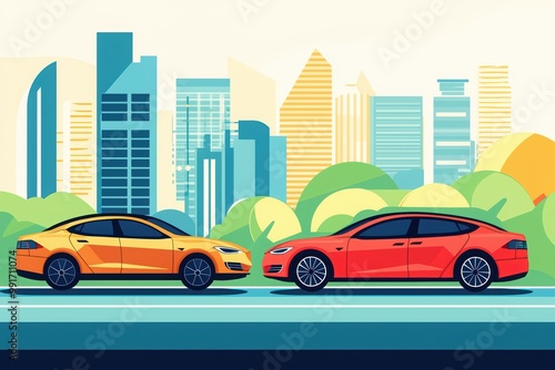 Two colorful cars on a city road with skyscrapers and greenery in the background.