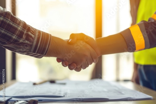 agreements, expertise, handshake, horizontal, male, photo, two people, construction worker, people, cooperation, greeting, indoor, man, occupation, success, teamwork, working, congratulating, business, engineer, hard hat, manager, planning, color image, closeup, construction site, headwear, industry, architect, client, factory, inspector, lifestyle, real estate