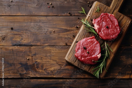 Two corners of two fresh raw steaks placed on a wooden cutting board with copy space.