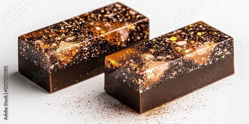 chocolate, bar, cosmic, gold, art, design, white, background, luxurious, shimmering, speck, artistic, epicure, dessert, confectionery, sweet, treat, elegant, decorative, shiny, glossy, rich, indulgent, creative, unique, stylish, modern, culinary, craft, intricate, detailed, premium, exclusive, sophisticated, fancy, opulent, edible, luxury, sparkle, glistering, texture, pattern, visual, appealing, aesthetic