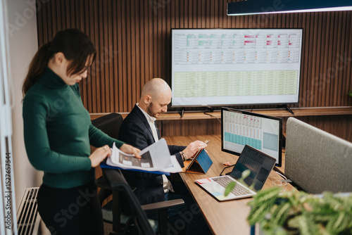 Two coworkers engaged in data analysis and collaboration within a modern office environment, emphasizing business tasks, teamwork, and productivity.