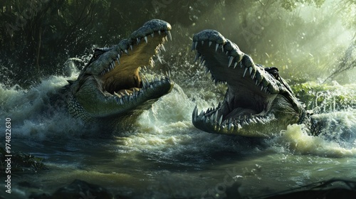 Two Crocodiles Facing Each Other with Open Mouths in a River