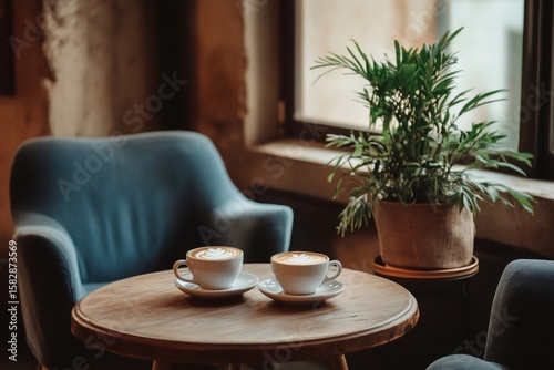 Two cups of cappuccino are placed on a small wooden table in a coffee shop, next to a houseplant and comfortable armchairs