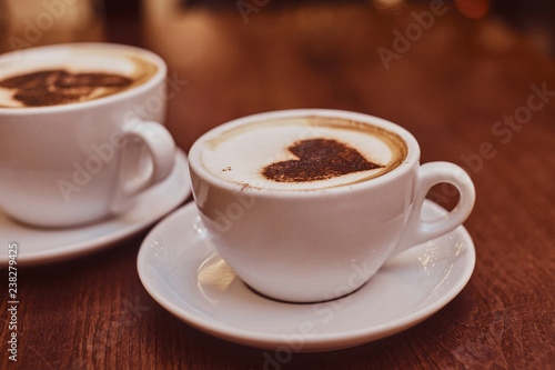 Two cups of hot coffee with art on the wooden table in a coffee shop, blur background with bokeh effect
