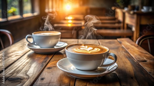 Two Cups of Steaming Latte Art Coffee on a Rustic Wooden Table in a Cafe Setting