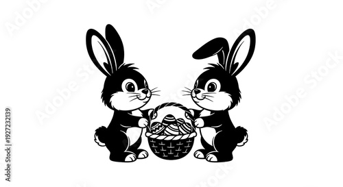 rabbit, rabbit, easter, basket, egg, cartoon, cute, illustration, black, white, patterned, decorated, friends, pair, duet, animal, wildlife, festive, holiday, celebration, spring, character, mascot, drawing, vector, art, clipping, smiling, happy, playful, children, design, graphic, tradition, seasonal, symbol, gift, sharing, cooperation, sweet, long, ear, tail, furry, mammal, small