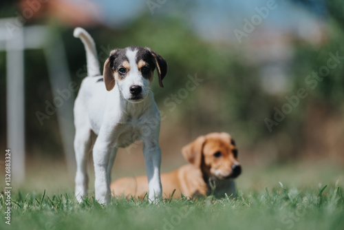 Two cute puppies enjoying a playful day outdoors. One is in focus while the other rests in the background, showcasing a delightful portrait of youthful energy and friendship.