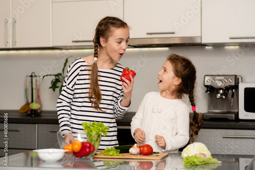 Two cute sisters' girls cut a salad from fresh vegetables. The girls are in the kitchen at home. They socialize and have fun while cooking. The concept of healthy eating. Healthy food. Childhood.