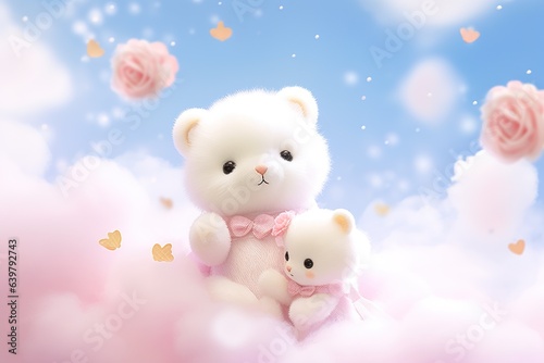 Two Cute teddy bears with flowers, clouds, and romantic backgrounds, Valentine's Day, Mother's Day, God is love