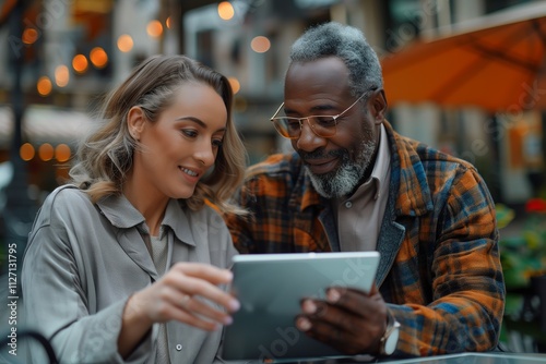 Two diverse individuals enjoying a digital device in a vibrant outdoor cafe setting.