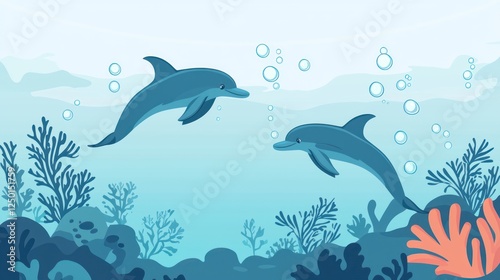 dolphin, ocean, sea, underwater, marin, water, coral, reef, bubble, animal, mammal, wildlife, nature, aquatic, life, blue, turquoise, swim, swimming, playful, happy, joyful, peaceful, serene, illustration, cartoon, graphic, design, art, digital, vector, cute, adorable, friendly, beautiful, scene, background, habitat, environment, ecology